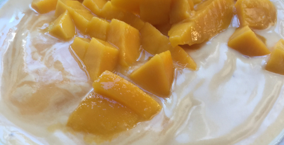 A Parsley Papaya Banana Mango Coconut milk Bowl goodness topped with Chia and Flax seeds